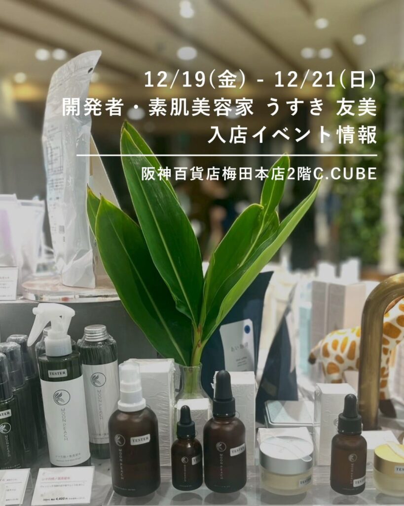 12/19(金) – 21(日)の3日間、開発者・素肌美容家 うすき友美が阪神百貨店梅田本店2F C.CUBE様店頭にて、皆様のお肌のお悩みやご質問にお答えいたします。